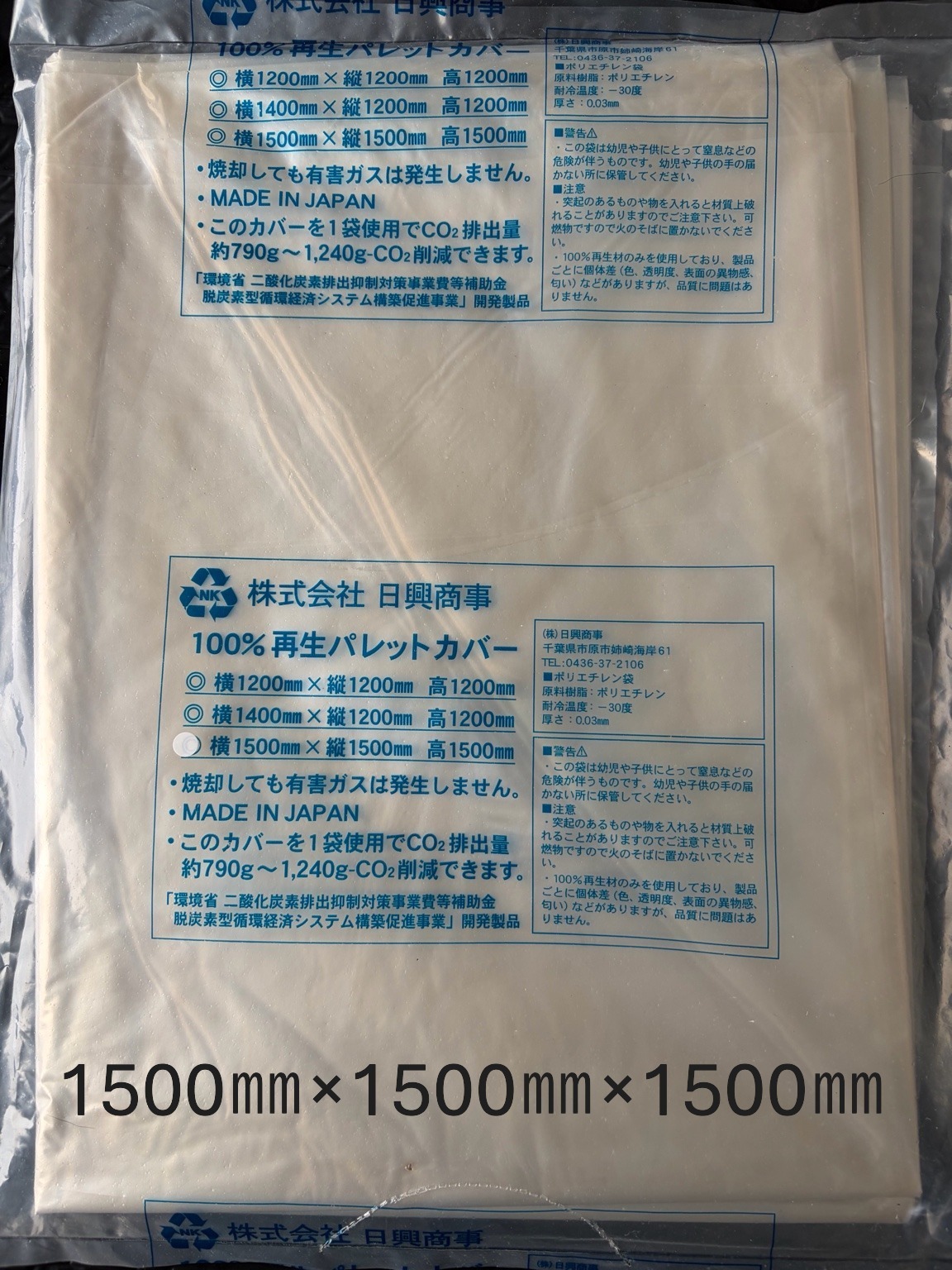 | 縦1500㎜×横1500㎜×高1500㎜×0.03㎜ | 箱 | 1箱辺り 30枚 | 1箱辺り43.44kg |