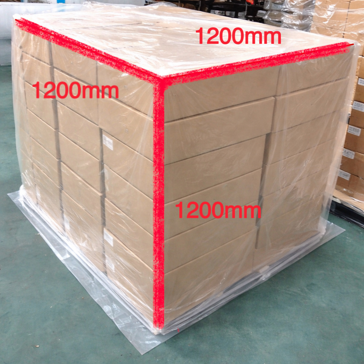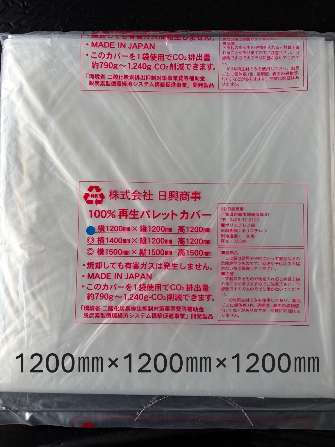 | パレットカバー (サイズ調整可能) | 縦1200㎜×横1200㎜×高1200㎜×0.03㎜ | 箱 | 1箱辺り 50枚 | 1箱辺り37.50kg |