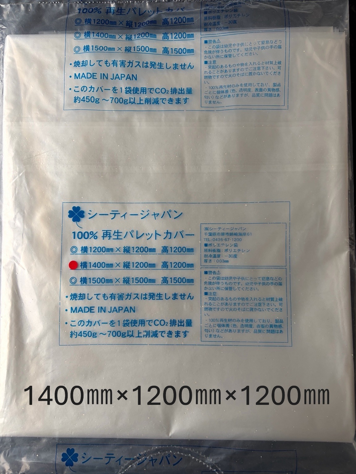 | 縦1400㎜×横1200㎜×高1200㎜×0.03㎜ | 箱 | 1箱辺り 50枚 | 1箱辺り40.17kg | |